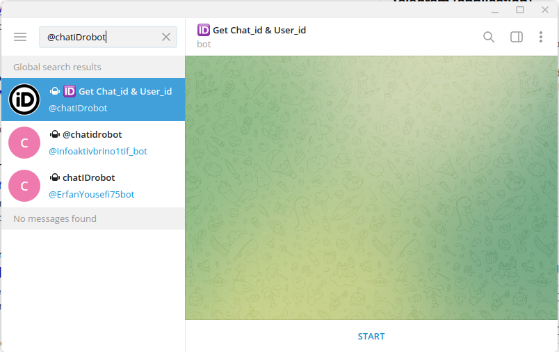 - Dans le champ de recherche, entrez @chatIDrobot et cliquez sur le bouton "start" en bas.
