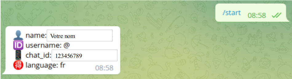 - Le bot vous renvoie votre numéro de "chat id"