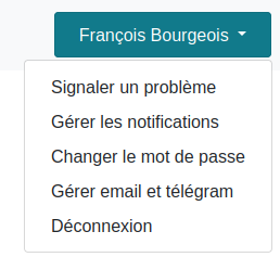 - Vous pouvez gérer les notifications que vous allez recevoir par Télégram. Pour se faire allez dans Calorga, dans le menu en haut à droite avec votre nom, choisissez l’option "Gérer les notifications".